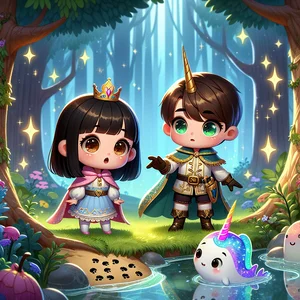 En ese mismo instante, Twinkle, la Estrella Soñadora, descendió del cielo. Era de un azul violeta suave y susurró: "Siento tristeza en el aire, algo no anda bien". Twinkle podía hacer almohadas de sueños y ver películas felices toda la noche. Era muy especial. Entonces, ¡pum!, llegó Noodle, el Caballero Narval, con su brillante armadura verde y su cuerno mágico que brillaba cuando detectaba tesoros. "¡Un misterio!", exclamó Noodle. "¡Y yo adoro los misterios!" Noodle podía respirar bajo el agua y su cuerno detectaba tesoros.