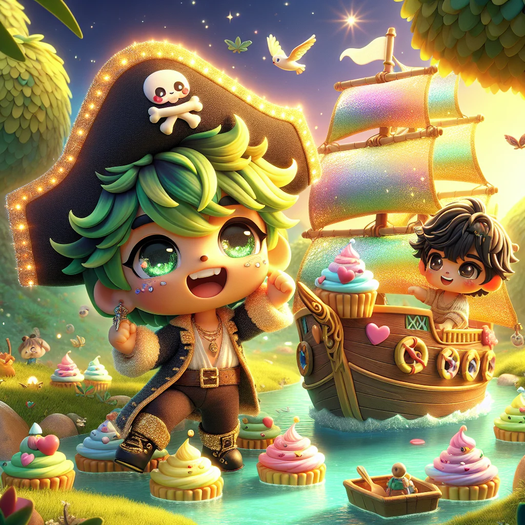 Dans la douce prairie, là où l'herbe chatouillait les genoux des sauterelles et où le soleil peignait le ciel de teintes douces, la vie coulait paisiblement. C'est dans ce coin de paradis que vit le Capitaine Pompom. Imaginez une pirate, mais pas n'importe laquelle ! Elle portait des bottes qui scintillaient comme des étoiles filantes et son navire, oh là là, c'était une merveille ! Construit entièrement de petits gâteaux moelleux, avec des tours de crème glacée et des voiles en sucre d'orge, il s'appelait « La Voile Sucre d'Orge ». Ce navire ne coulait jamais, car son glaçage était aussi imperméable que le sourire du Capitaine Pompom. Et elle, elle était la joie incarnée : ses cheveux verts et jaunes dansaient au vent, et sa voix était un mélange pétillant d'enthousiasme. Elle avait un pouvoir spécial : d'un simple cri de cheer, elle pouvait faire briller n'importe quoi ! On disait même qu'elle n'avait jamais perdu une seule battle de danse. Non loin de là, Loulou, un jeune garçon aux mains agiles, était occupé à construire. Il adorait assembler des choses, comme les dinosaures qu'il dessinait sur son carnet. Aujourd'hui, il fabriquait des petits bateaux avec des feuilles robustes, imaginant des courses sur la mare. Il aimait le calme de la prairie, mais les grands bruits, comme les acclamations, le faisaient un peu tressaillir. Il espérait que les Jeux Annuels de la Prairie seraient doux cette année. Les préparatifs allaient bon train, et l'excitation montait comme une bulle de savon dans l'air tiède. Le plus attendu de tous était la course « Fruity Fling », une compétition où les bateaux les plus originaux s'affrontaient sur l'eau scintillante de la mare.