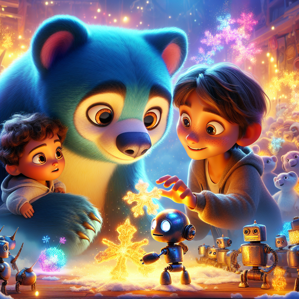 Dans une immense Fabrique de Robots, grouillait une activité fébrile. On préparait la grande exposition de jouets, un événement où les robots les plus fantastiques étaient présentés. Au milieu de cette effervescence, vivait Pola, une adorable ourse polaire aux oreilles bleues, au pelage d'un turquoise foncé. Pola adorait les aventures glaciales et les câlins chaleureux, et, surtout, elle avait un don : elle pouvait créer des flocons de neige aux formes les plus incroyables. Un jour, alors qu'elle explorait la fabrique, Pola fut accidentellement mélangée à des pièces de robots ! La maladresse de Pola était légendaire !