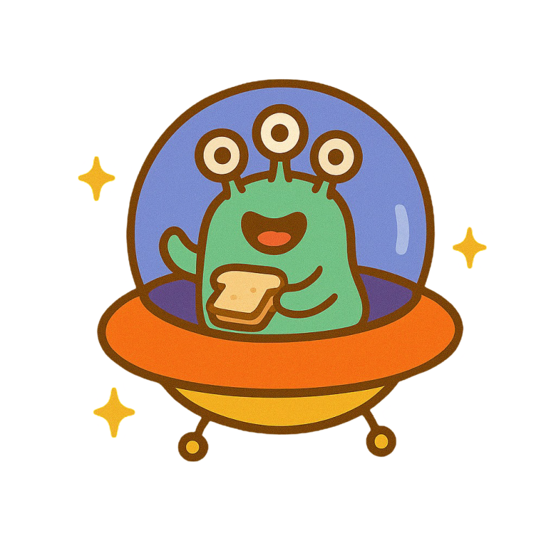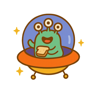 ત્રણ આંખો અને પીનટ બટર સેન્ડવિચ માટે પ્રેમ ધરાવતો નાનો, વળીલો એલિયન. બબલ સોસરમાં ફરતો અને ચમકદાર હાસ્ય કરતો.