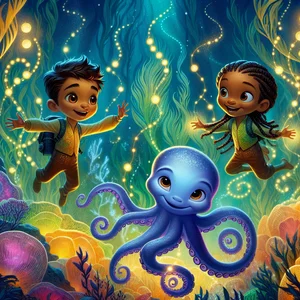 जब वे पहुंचे, तो ऐसा लग रहा था जैसे वे एक जीवंत, पानी के नीचे की दुनिया में उतरे थे। रंग हर जगह थे! हरे, नीले, लाल रंग की घास, और सुनहरी रेत। अचानक, उन्होंने एक दोस्त देखा! यह वॉबल नाम का एक जेली ऑक्टोपस था, जो समुद्र के पानी से बना था। वॉबल का शरीर हल्का नीला था और वह बहुत ही लचीला था।