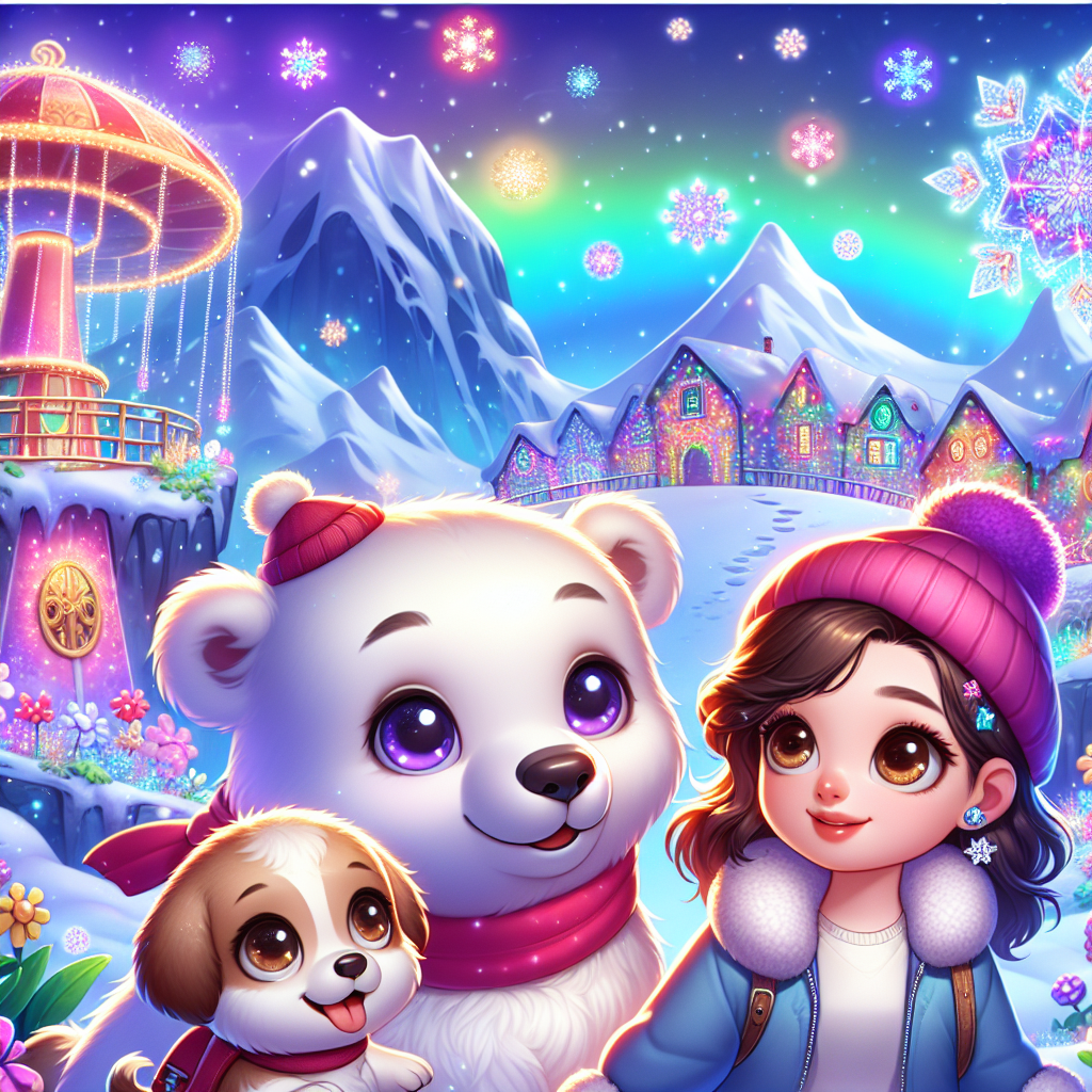 एक ऊँचे पर्वत शिखर पर, जहाँ बर्फ़ चमचमाती थी और हवा ताज़ी थी, पोला, सनी और क्लोवर रहते थे। पोला, एक प्यारा सा, गहरे फ़िरोज़ी रंग का, नीला कानों वाला ध्रुवीय भालू था, जो बर्फीले कारनामों को पसंद करता था और गर्म गले लगाना चाहता था। सनी, एक नारंगी-लाल रंग का, प्यारा बादल पिल्ला था जो बादलों के बीच उछलता था और जहाँ भी जाता, धूप लेकर आता था, हमेशा खिलखिलाता रहता था। और क्लोवर, एक गहरा गुलाबी, जंगल का पौधा था, जिसके पत्ते धूप से गुदगुदी होने पर खिलखिलाते थे।
