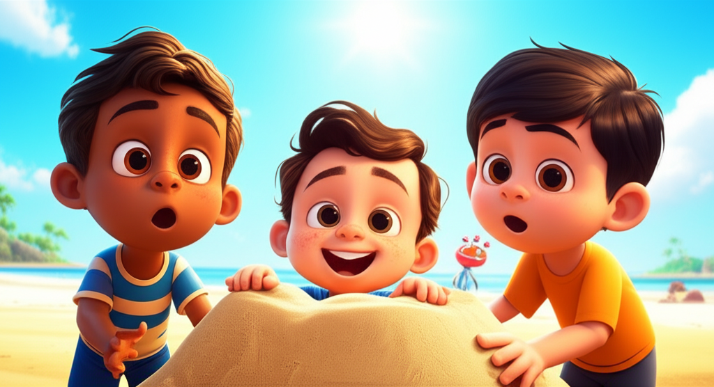 एक दिन, सूरज चमक रहा था और लहरें धीरे-धीरे सनी बीच पर आ रही थीं। एलेक्स और जॉर्डन रेत पर फुटबॉल खेल रहे थे। "गोल!" एलेक्स चिल्लाया, जैसे ही उसने गेंद को किक मारी। जॉर्डन ने ताली बजाई। अचानक, "ज़रूर!" एलेक्स की फुटबॉल, 'टपटप' करते हुए गायब हो गई! एलेक्स और जॉर्डन चौंक गए।