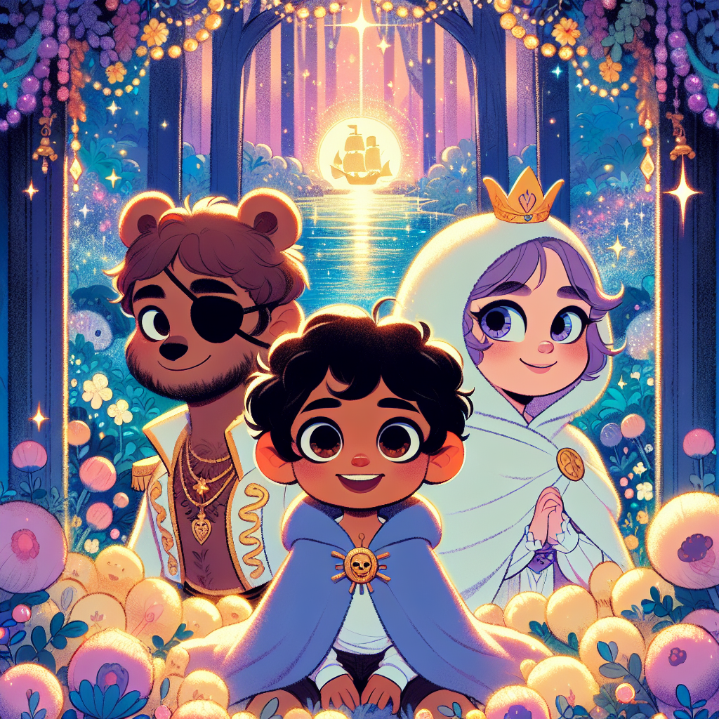 Di dekatnya, Pangeran Beruang Bajak Laut, beruang pemberani dengan mahkota emas dan penutup mata bajak laut, sedang berdiri dengan ekspresi bingung. "Ada apa dengan Sparkle-Berries ini?" gumam Pangeran Beruang Bajak Laut, suaranya dalam dan berwibawa. Dia berbicara pada semua makhluk hutan, burung-burung, tupai-tupai, bahkan pada pohon-pohon tua yang bijaksana, tetapi tidak ada yang tahu apa yang salah.