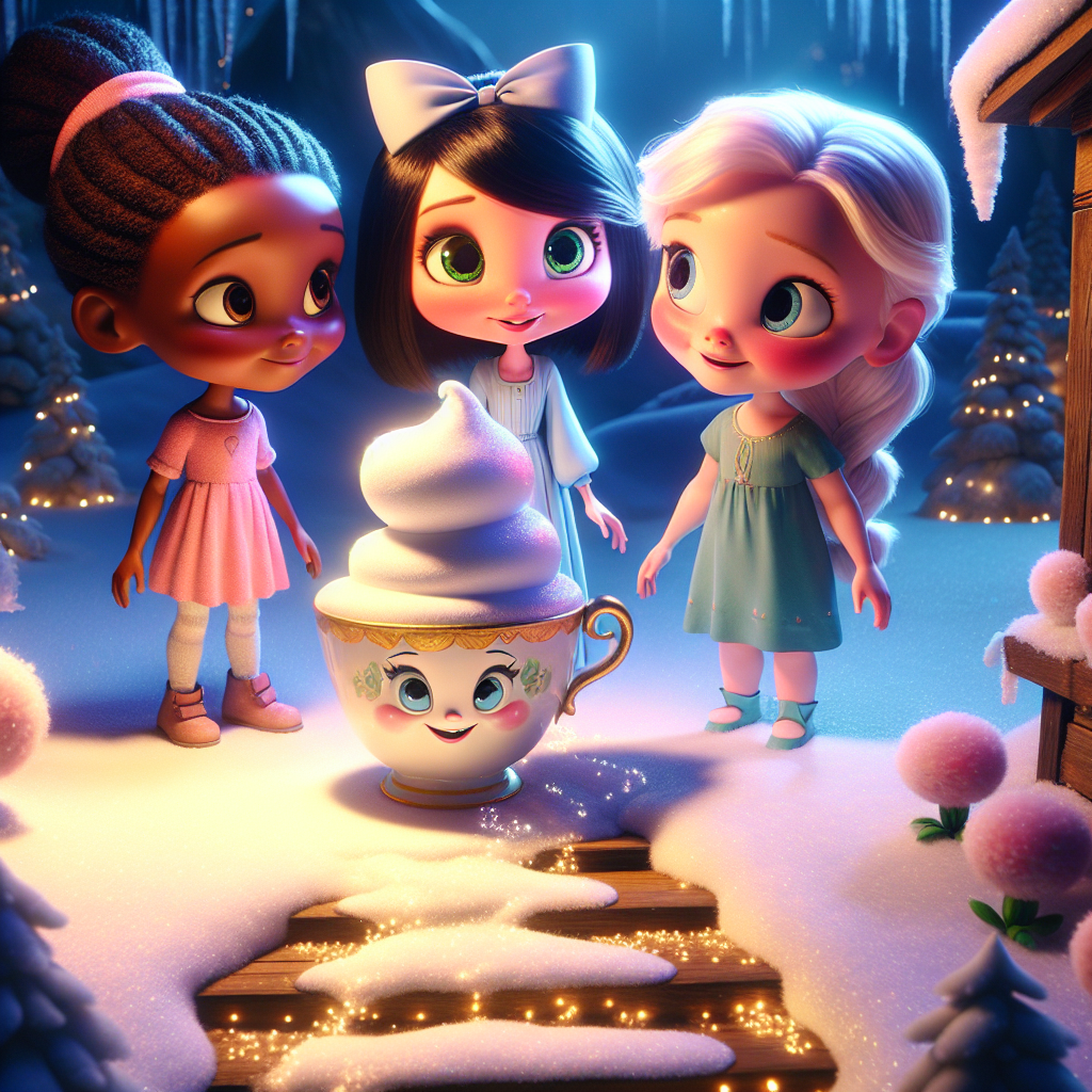 Zara, Anya e Aurora avevano una passione per le avventure. Un giorno, in cima alla Montagna Brillante, trovarono qualcosa di straordinario. Mentre ammiravano il panorama, videro una scia scintillante, profumata di vaniglia, che scendeva giù per la montagna. "Che cos'è?" chiese Zara, incuriosita. "Sembra...magia!" esclamò Anya, gli occhi che brillavano di eccitazione. Aurora, che amava le cose scintillanti, si unì subito a loro. La scia le guidò verso una casetta a forma di tazza da tè. Dalla porta, spuntò una fata magenta, minuscola e dolce come un marshmallow. Era Mimi, la Fata Marshmallow, con le guance rosate e un sorriso rassicurante. "Benvenute!" disse Mimi, la sua voce era dolce come il caramello. "Sono così contenta di vedervi!"
