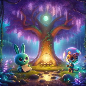 Tockie il Coniglio del Tempo, una creatura di precisione e morbidezza color teal, si fermò di colpo. Tockie, con il suo orologio da taschino color viola scuro che non aveva mai tardato nemmeno di un secondo, controllò il suo polso. "Strano," mormorò, la sua voce allegra ma anche un po' perplessa. "Secondo il mio orologio, tutto dovrebbe essere esattamente in orario. Ma l'Albero di Pecan... sembra essersi fermato." Tockie era un coniglio che amava la natura e tutti i suoi abitanti, ma adorava anche la regolarità. Vedere l'albero così, immobile e spento, gli fece prudere le zampe. Si avvicinò all'albero, toccando con delicatezza una noce spenta. Non c'era alcun ticchettio, nessun calore. Solo freddo e silenzio. "Non va bene, non va bene affatto," disse a se stesso, tirando fuori una carota che sapeva sempre l'ora giusta. "Sembra che il tempo della foresta si sia inceppato." Tockie si mise il suo orologio da taschino al collo, lo caricò con un movimento rapido e decise che era giunto il momento di scoprire cosa era successo al battito cardiaco della foresta. Doveva riportare il tempo a funzionare, perché la foresta e i suoi amici dipendevano da esso.