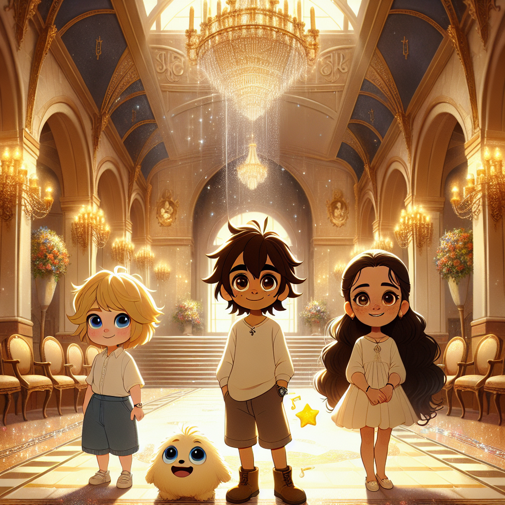 昔々、きらきら城という魔法のお城がありました。空には星が踊り、塔は子守唄を歌い、お堀には星の光が流れました。ある日、ディエゴ、イボンヌ、チュンの3人の子供たちに、不思議な招待状が届きました。招待状は、きらきら城の紋章が描かれた美しい青い鳥の羽でできていました。「きらきら城へようこそ! あなたを待っています。」と書かれていました。