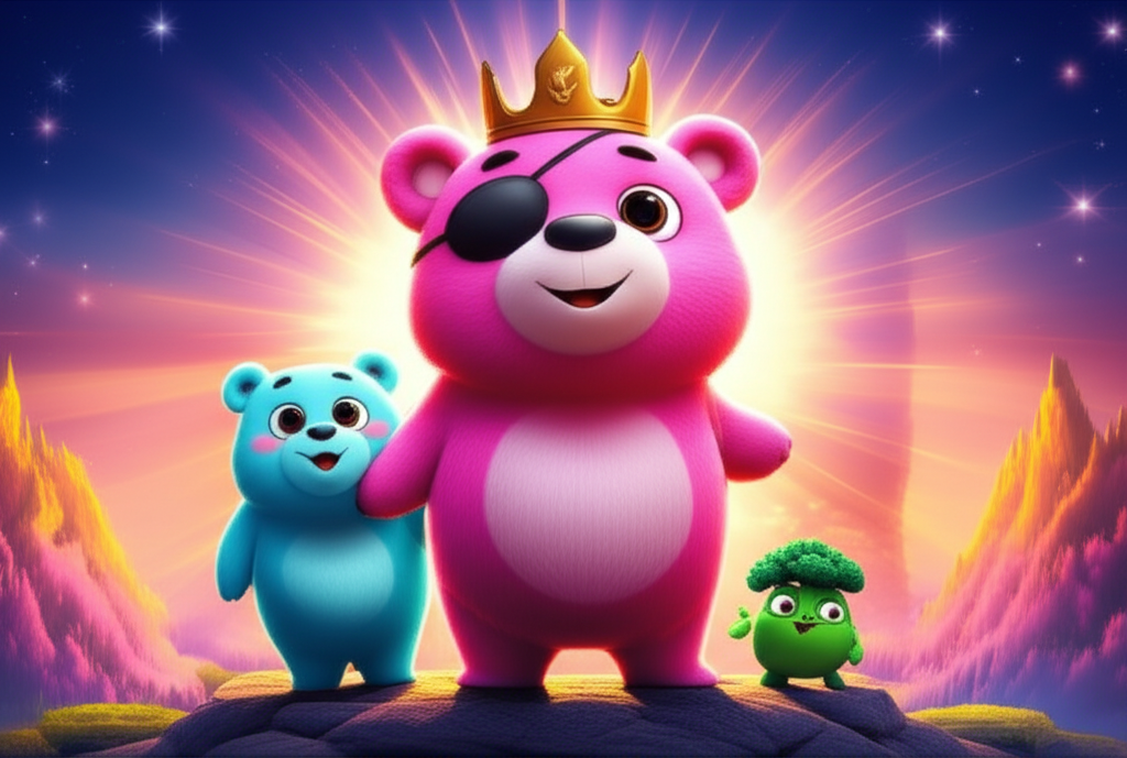 ಒಂದು ಬೆಟ್ಟದ ತುದಿಯಲ್ಲಿ, ವಿಶ್ವರಹಸ್ಯಮಯವಾದ "ಗುಸುಗುಸು ಶಿಖರ" ಎಂಬ ಸ್ಥಳದಲ್ಲಿ, ಪ್ರಿನ್ಸ್ ಪೈರೇಟ್ ಬೇರ್ ತನ್ನ ಚಿನ್ನದ ಕಿರೀಟವನ್ನು ಧರಿಸಿ ಆಳುತ್ತಿದ್ದನು. ಆ ಬೆಟ್ಟವು ವಿಚಿತ್ರವಾದ ಶಬ್ದಗಳನ್ನು ಮಾಡುತ್ತಿತ್ತು, ಕೆಲವೊಮ್ಮೆ ಗುಸುಗುಸು ಹಾಗು ನಗು, ಮತ್ತು ಆಗಾಗ್ಗೆ ಹಾಡನ್ನು ಹಾಡುತ್ತದೆ. ಪ್ರಿನ್ಸ್ ಪೈರೇಟ್ ಬೇರ್ ತನ್ನ ರಾಜ್ಯವನ್ನು ದಯೆಯಿಂದ ರಕ್ಷಿಸುತ್ತಿದ್ದನು, ಜೇನುತುಪ್ಪದ ಚಹಾವನ್ನು ಬಹಳವಾಗಿ ಇಷ್ಟಪಡುತ್ತಿದ್ದನು ಮತ್ತು ಕಾಡಿನ ಪ್ರಾಣಿಗಳೊಂದಿಗೆ ಮಾತನಾಡಲು ಸಾಧ್ಯವಾಗುತ್ತಿತ್ತು. ಅವನಿಗೆ 37 ವಿವಿಧ ಕಿರೀಟಗಳ ಸಂಗ್ರಹವಿತ್ತು ಮತ್ತು ಒಂದು ಬಾರಿ ಫ್ಲಫಿ ಸಮುದ್ರದಲ್ಲಿ ಕಳೆದುಹೋದ ಟೆಡ್ಡಿ ಬೇರ್ಸ್ಗಳನ್ನು ರಕ್ಷಿಸಲು ಪ್ರಯಾಣಿಸಿದನು.