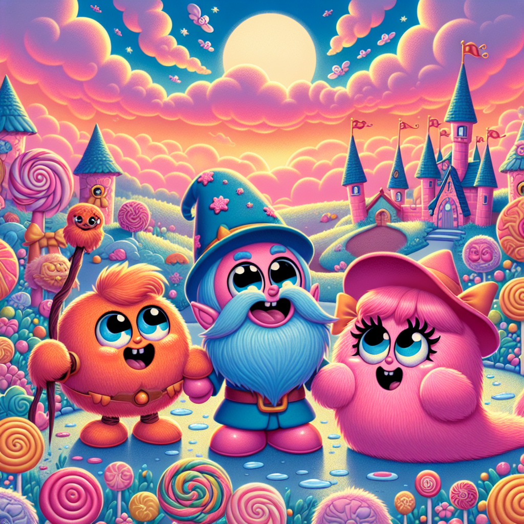 옛날 옛적, 사탕 구름과 롤리팝 나무가 가득한 마법의 성이 있었어요. 성 안에는 페퍼민트 강, 초콜릿 언덕, 그리고 젤리 빈 다리까지 있었죠! 이 성에는 세 명의 아주 특별한 친구들이 살고 있었는데, 바로 롤리팝 마녀 피치, 눈송이 마법사 글림, 그리고 살몬 색깔의 로봇 친구 조기였어요.