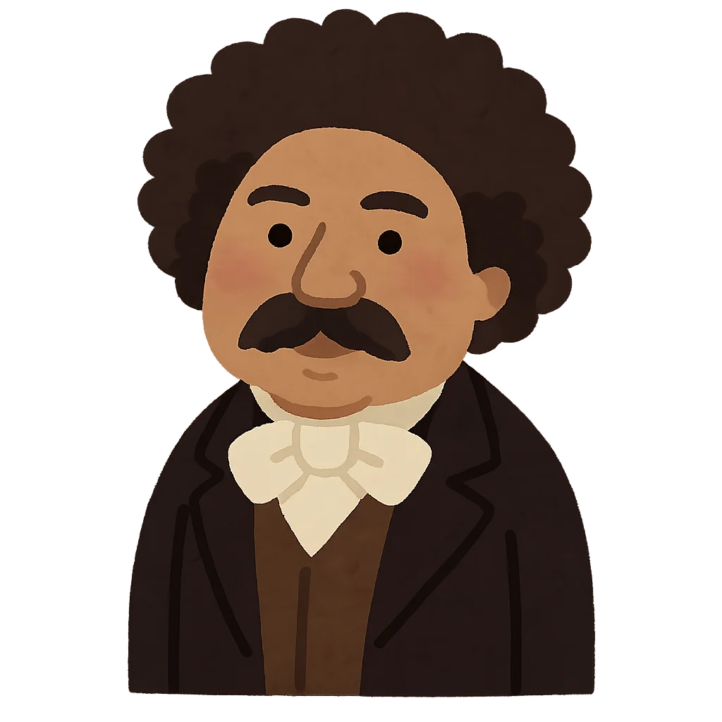 Bonjour! My name is Alexandre Dumas, and I have some of the most exciting stories to tell you. I was born on July 24th, 1802, in a small French town called Villers-Cotterêts. My father, Thomas-Alexandre Dumas, was a brave general in the French army, and his adventures always amazed me. My grandmother, Marie-Cessette, was from a place called Haiti, and her story, along with my father's bravery, filled my head with wonderful ideas. My father passed away when I was only four years old, and after that, my family didn't have much money. Despite this, my mother made sure I learned how to read. I read every book I could find and dreamed that one day I would write my own tales of heroes and faraway lands.