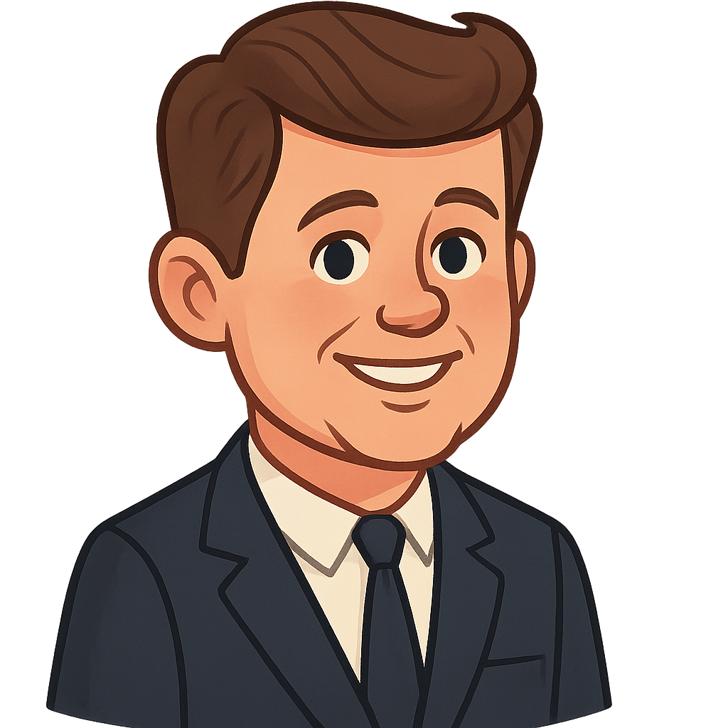 In 1961, the American people gave me the greatest honor of my life: they elected me to be the 35th President of the United States. My wife, Jacqueline, and I moved into the White House with a message of hope and energy. I spoke of a 'New Frontier,' a challenge for our nation to be its best and bravest self. I wanted to inspire a new generation to aim high. I challenged our country to achieve an incredible goal: to land a person on the moon before the end of the decade. It seemed impossible to some, but I believed in our ability to reach for the stars. I also wanted to spread peace and friendship around the world, so I created the Peace Corps, which sent young Americans to other countries to help with projects like teaching and farming. In my first speech as president, I said some words that I hope you will remember: 'Ask not what your country can do for you—ask what you can do for your country.' I wanted everyone to feel that they had the power to make a difference. Sadly, my time as president and my life were cut short in 1963. But I hope my story inspires you to be curious, to serve others, and to have the courage to explore your own new frontiers.