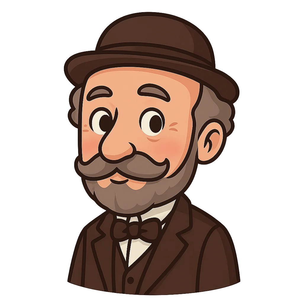 こんにちは!私の名前はジョルジュ・メリエス。私がどのようにして映画で魔法を生み出すようになったか、お話ししましょう。私は1861年12月8日にフランスのパリで生まれました。私の家族は成功した靴工場を経営していましたが、私はいつも絵を描いたり、物を作ったりすることに夢中でした。子供の頃、私は自分だけの人形劇の劇場を作り、家族のためにショーを上演していました。青年になった私はロンドンへ行き、そこで信じられないような舞台マジシャンたちに出会いました。その時、私はイリュージョニストになりたいと心に決めたのです!1888年、私は遺産を使ってパリの有名なロベール=ウーダン劇場を買い取り、そこで独自のイリュージョンを設計し、有名なマジシャンになりました。