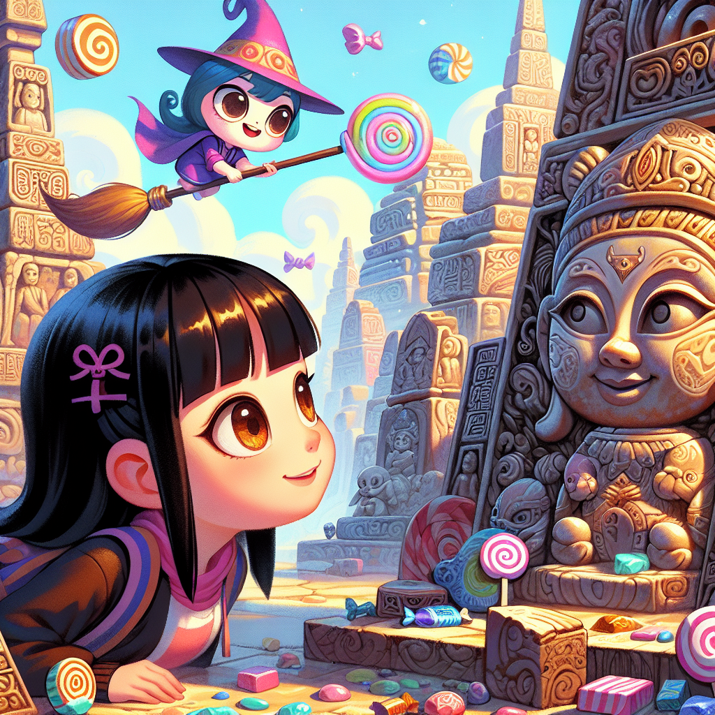 പുരാതനമായ ഒരു സ്ഥലത്ത്, മനോഹരമായ കൊത്തുപണികളുള്ള ചുമരുകൾക്കിടയിലൂടെ, മൃഗങ്ങളെ വരയ്ക്കാൻ ഇഷ്ടപ്പെടുന്ന മെയ് എന്നൊരു പെൺകുട്ടി നടന്നുപോവുകയായിരുന്നു. ചരിത്രത്തെക്കുറിച്ച് അറിയാനും അവൾക്ക് വളരെ ഇഷ്ടമായിരുന്നു. അവൾ അവളുടെ നോട്ട്ബുക്കിൽ ഓരോ കൊത്തുപണികളും ശ്രദ്ധയോടെ പകർത്തി വരച്ചു. പെട്ടന്നാണ്, ഒരു പ്രത്യേകതരം ശബ്ദം കേട്ടത്, അതൊരു തിളങ്ങുന്ന കുമിളകളുടെ ശബ്ദമായിരുന്നു. ആ കുമിളകളെ പിന്തുടർന്ന് അവൾ ഒരു പിങ്ക് നിറമുള്ള, ഫിസി സോഡാ കൊണ്ടുണ്ടാക്കിയ ചൂലിൽ പറക്കുന്ന, പീച്ചി എന്നൊരു മന്ത്രവാദിയെ കണ്ടു. പീച്ചിയുടെ തൊപ്പി ഒരു വലിയ മിഠായി ആയിരുന്നു. അവൾ കാൻഡി മന്ത്രവാദിനിയാണെന്നും മിഠായി ഉപയോഗിച്ചുള്ള മാന്ത്രികശക്തി ഉപയോഗിച്ച് അവൾ ഈ സ്ഥലത്ത് താമസിക്കുന്നു എന്നും മെയ്യോട് പറഞ്ഞു. പീച്ചി അവളുടെ വേഫർ പേജുകളും, ഐസിംഗ് മഷിയും ഉപയോഗിച്ച് ഉണ്ടാക്കിയ മാന്ത്രിക പുസ്തകം കാണിച്ചു. പച്ചക്കറികൾ 24 മണിക്കൂറിനുള്ളിൽ മിഠായി ആക്കുന്നതിനെക്കുറിച്ച് അവൾ വിശദീകരിച്ചു. പീച്ചിയുടെ കളിയായ സ്വഭാവവും, മാന്ത്രികമായ ചുറ്റുപാടുകളും മെയ്യുടെ ഭാവനയെ ഉണർത്തി, അവർ പെട്ടെന്ന് കൂട്ടുകാരായി. എന്നാൽ, പീച്ചി ഇപ്പോൾ ഒരു പ്രശ്നത്തിലായിരുന്നു, അവളുടെ മിഠായി ഉണ്ടാക്കുന്ന മാന്ത്രികശക്തി കുറഞ്ഞുപോയിരുന്നു.