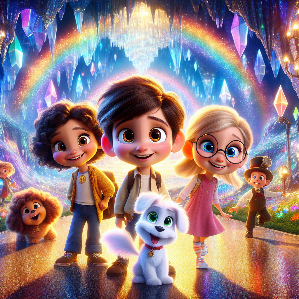 De Tijdreis-machine zoemde en draaide, en met een flits landde ze in een glinsterende Kristalgrot. De muren van de grot waren gemaakt van kristal, en weerkaatsten het licht in duizend kleuren. Mateo, Amelia en Thomas stapten voorzichtig uit. "Wauw!" fluisterde Amelia. "Het is hier magisch!" De Wolkenhond Sunny sprong uit het portaal van de machine, vol enthousiasme.