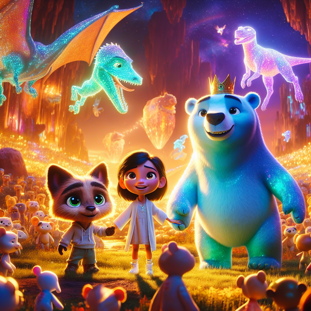 In de uitgestrekte en wonderlijke ruimte, zweefde het Starry Sanctuary, een ruimtestation als geen ander. Hier, tussen glinsterende sterren en gigantische, kleurrijke bellen die als zeepbellen zweefden, woonden drie bijzondere vrienden: Bearon de Koninklijke Pluis, een hemelsblauwe beer met een kroon en een hart van goud; Zuzu de Bellenkat, een eveneens hemelsblauwe kat die in een zwevende bel woonde en magische bellen blies; en Rollo de Rollende Egel, een oranje egeltje met een onstilbare honger naar avontuur. Aarav zou dit prachtig vinden, met al die ruimte en zeepbellen!
