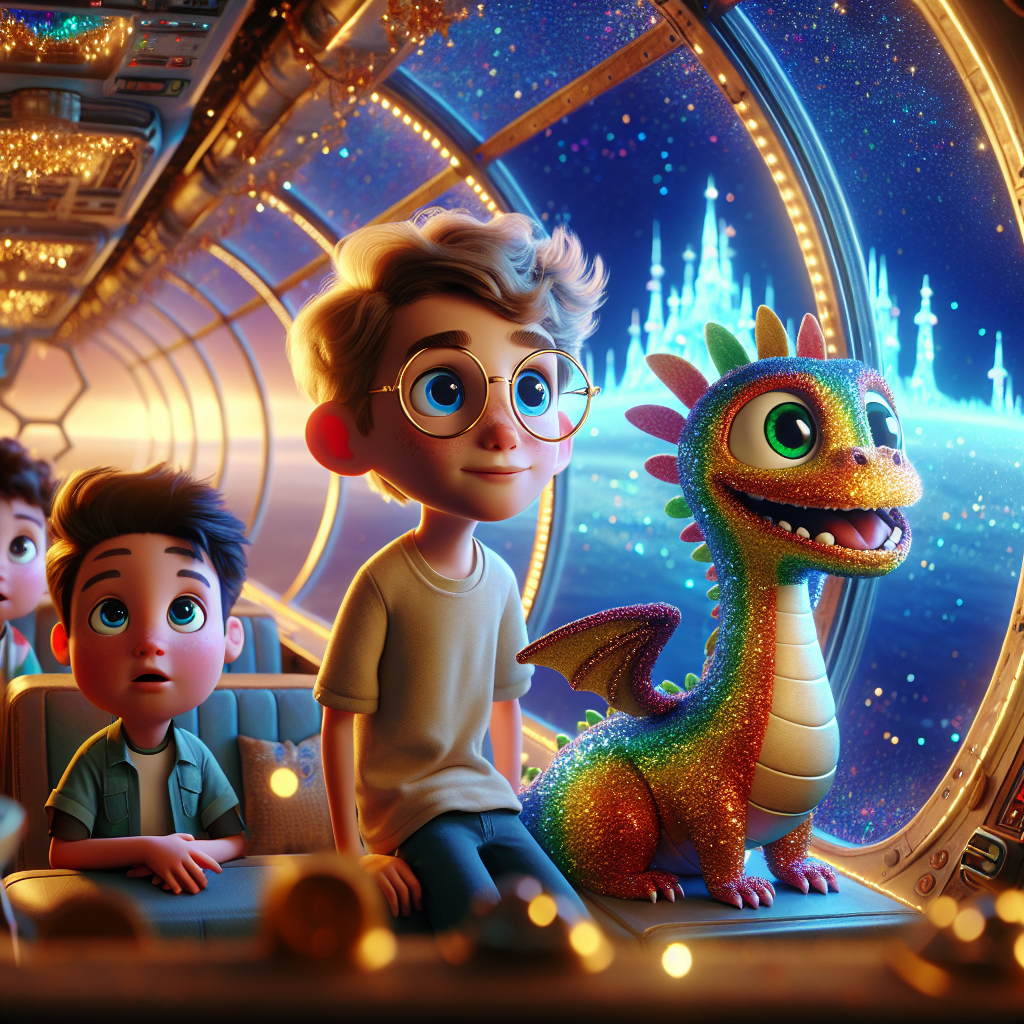 Когда корабль был готов, они отправились в путь. Путь был долгим, но увлекательным. Вдруг перед ними возникла радужная полоса. Это был Фризл, Радужный Дракон, дышащий блестками. Его чешуя переливалась всеми цветами радуги. Фризл был другом принцессы Люмы и знал дорогу к замку. "Следуйте за мной!" – весело крикнул Фризл, и они полетели за ним, оставляя за собой след из разноцветных искр. "Звёздный Замок полон чудес, – рассказывал Фризл, – у него 143 комнаты, и каждая меняется каждый день. Мост там из жидкой звёздной пыли".