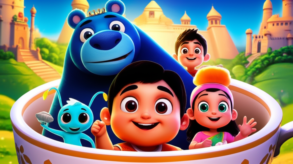 ఒకానొక సమయంలో, ఒక విశాలమైన గదిలో, ఒక పెద్ద టీ కప్పు ఆకారంలో ఉన్న టైమ్ మెషిన్ ఉంది. ఆ మెషిన్ లోపల, డీప్ స్కై బ్లూ రంగులో ఉండే బెరోన్ అనే ఒక అందమైన, మృదువైన ఎలుగుబంటి ఉంది. అతని కిరీటం మెరుస్తూ ఉంది మరియు అతని రోమములు గాలిని బట్టి పొంగి పోతున్నాయి. అతనితో పాటు నీలి ఊదా రంగులో ఉండే, మెరిసే రెయిన్బో డ్రాగన్ ఫ్రిజిల్, మరియు లైమ్ రంగులో ఉండే, వింతైన మూడు కళ్ళ స్పేస్ ఏలియన్ నునీ ఉన్నారు. వారి స్నేహితులు, మరియు టీ పార్టీకి ఎప్పుడూ సిద్ధంగా ఉంటారు.