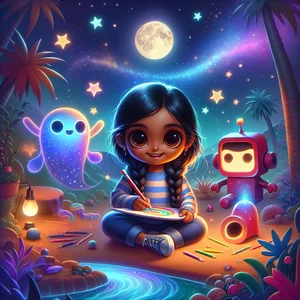 Aditi, sekiz yaşında, büyülü hikayelere ve çizim yapmaya bayılan, meraklı bir kızdı. Tarih kitaplarını okumaya ve eski medeniyetlerin gizemlerini öğrenmeye bayılırdı. Özellikle Mısır'ın gizemli piramitleri ve hiyeroglifler onu büyülerdi. Bir gece, çölün ortasındaki huzurlu bir vaha olan evinde, yıldızlar parıldarken, Aditi çizim defterine yeni resimler çiziyordu. Aniden, gökyüzünden bir şeyler düşüyordu. "Vıııızz!" diye bir ses duydu ve parlak bir ışık huzmesiyle birlikte, yere minik, kırmızı bir robot çarptı! Üzerinde "Boop" yazan, kırmızı renkli, minicik bir robottu bu. Boop, Ay'dan geliyordu ve kollarını açarak kocaman sarılmalar yapmayı çok seviyordu. "Bip, bip!" diye sesler çıkararak, düşmekten dolayı biraz üzgündü. Boop'un anteni, uyuyan çocukların rüyalarını toplamak için tasarlanmıştı ama ne yazık ki düşerken bozulmuştu. Onunla birlikte, yumuşak, mavi-menekşe renkli bir yıldız, Twinkle, da düşmüştü. Twinkle, uykulu gözleriyle etrafa bakındı ve "Vızzz..." diye mırıldandı. Twinkle, rüya yastıkları yapabilen ve her ninniyi bilen, uykucu bir yıldızdı. Aditi, şaşkınlıkla robot ve yıldıza baktı. Hemen çizim defterini çıkardı ve onları çizmeye başladı. Boop ve Twinkle'ın etrafında merakla dolaşan Aditi'ye, Boop "Bip, bip!" diye bağırdı, "Ben Boop, Ay'dan geldim ve sarılmayı çok severim! Bu da Twinkle, uykulu bir yıldız!" "Merhaba!" dedi Aditi, heyecanla. "Ben Aditi, çizim yapmayı ve tarih okumayı severim!" Boop, bozuk antenini göstererek, "Bip... Bip... Antenim kırıldı ve bu yüzden çocuklar rüyalarını kaybediyor!" dedi. Twinkle ise endişeyle, "Evet, normalde her gece ninni söylerdim ama bugünlerde ninni söylerken huzursuzluk hissediyorum." dedi. Aditi, bir an düşündü ve aklına bir fikir geldi. "Eski Mısırlılar hakkında bir şeyler okumuştum," dedi. "Vahadaki en eski yerde gizli bir kuyu varmış, orada eski sırlar saklı olabilir!" Üç arkadaş, hep birlikte kuyuyu bulmak için yola koyuldular. Yol boyunca, taş tabletlere kazınmış bilmecelerle karşılaştılar. İlk bilmece şuydu: