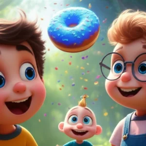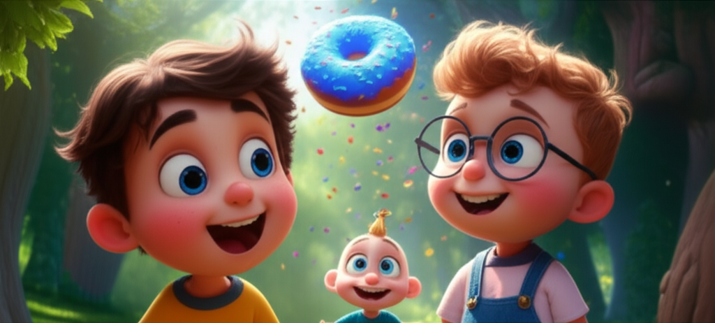 Tam o sırada, parlak dodger mavisi bir şey, ağaçların arasından hızla döndü. Yuvarlak ve ortasında kocaman bir deliği olan bir şeydi. Bu, Dizzy'ydi! Dizzy, sürekli dönen, en saçma şakaları yapan ve konfeti serpen bir uçan donut'tu. Dizzy, heyecanlandığında "Whoop!" diye ses çıkarır ve şakalarına göre konfetileri renk değiştirirdi. Dizzy, Ethan ve Louis'ye doğru yaklaştı.