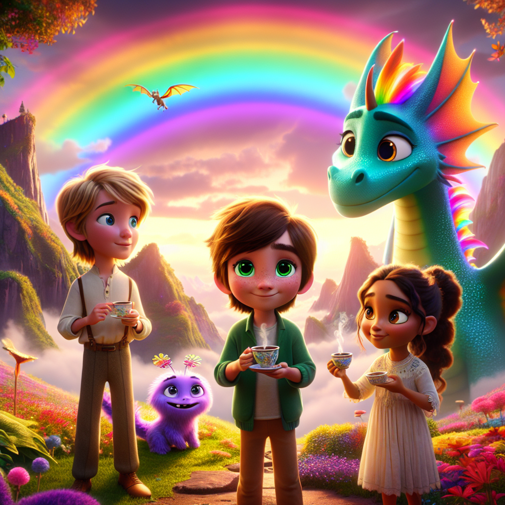 Yemyeşil Gökkuşağı Tepesi'nde, Frizzle adında, gökkuşağı renginde pulları olan, sihirli bir ejderha yaşıyordu. Frizzle'ın en sevdiği şey, tepedeki pembe çayırda, minik ağaç evinde çay partileri düzenlemekti. Ama Frizzle'ın öyle sıradan bir özelliği vardı ki, onu diğer ejderhalardan ayırıyordu: Ateş yerine, sadece parıltılı tozlar üflerdi. Bu parıltılar, gökyüzünde bir saat boyunca duran gökkuşakları oluştururdu. O gün de, Frizzle, en yakın arkadaşı, her gün başında farklı bir çiçek açan, konuşan bir bitki olan Clover ile birlikte çay içiyordu. Clover'ın pembe yaprakları güneş ışığında parlıyor, minik bir peri gibi görünüyordu. Layla, yumuşak sesiyle bir şarkı söylerken, Frizzle, pembe ve mor renkli parıltılarını üfleyerek gökyüzünde bir gökkuşağı oluşturdu. Gökkuşağı o kadar güzeldi ki, Arthur, elinde bir dürbünle tepeye tırmanmış, bu olağanüstü manzarayı hayranlıkla izliyordu. Arthur, şatolar ve şövalyelerle ilgili kitaplar okumayı çok severdi ve Gökkuşağı Tepesi ona bir masal şatosunu andırıyordu.
