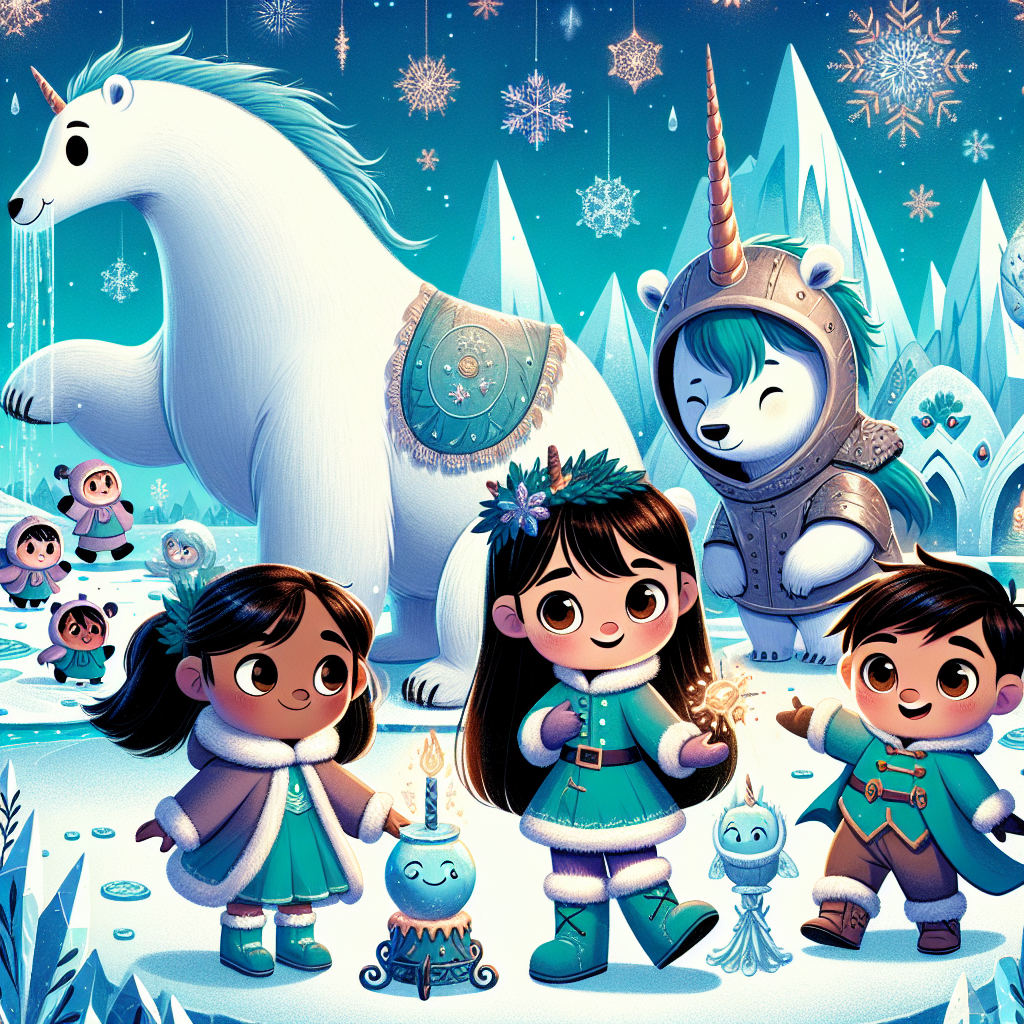 Buzdan büyülü bir şatoda, heyecanla beklenen bir gün gelmişti: Kış Masalı Şöleni! Bu şato, oyuncaklarla, şekerlemelerle ve kahkahalarla dolu bir yerdi. Şatonun en sevilen dostları, Pola, mavi kulaklı, koyu turkuaz renkli, sevimli bir kutup ayısı ve Noodle, parıldayan bir miğferi ve hazinelerin yerini gösteren bir boynuzu olan cesur bir deniz atı şövalyesiydi.