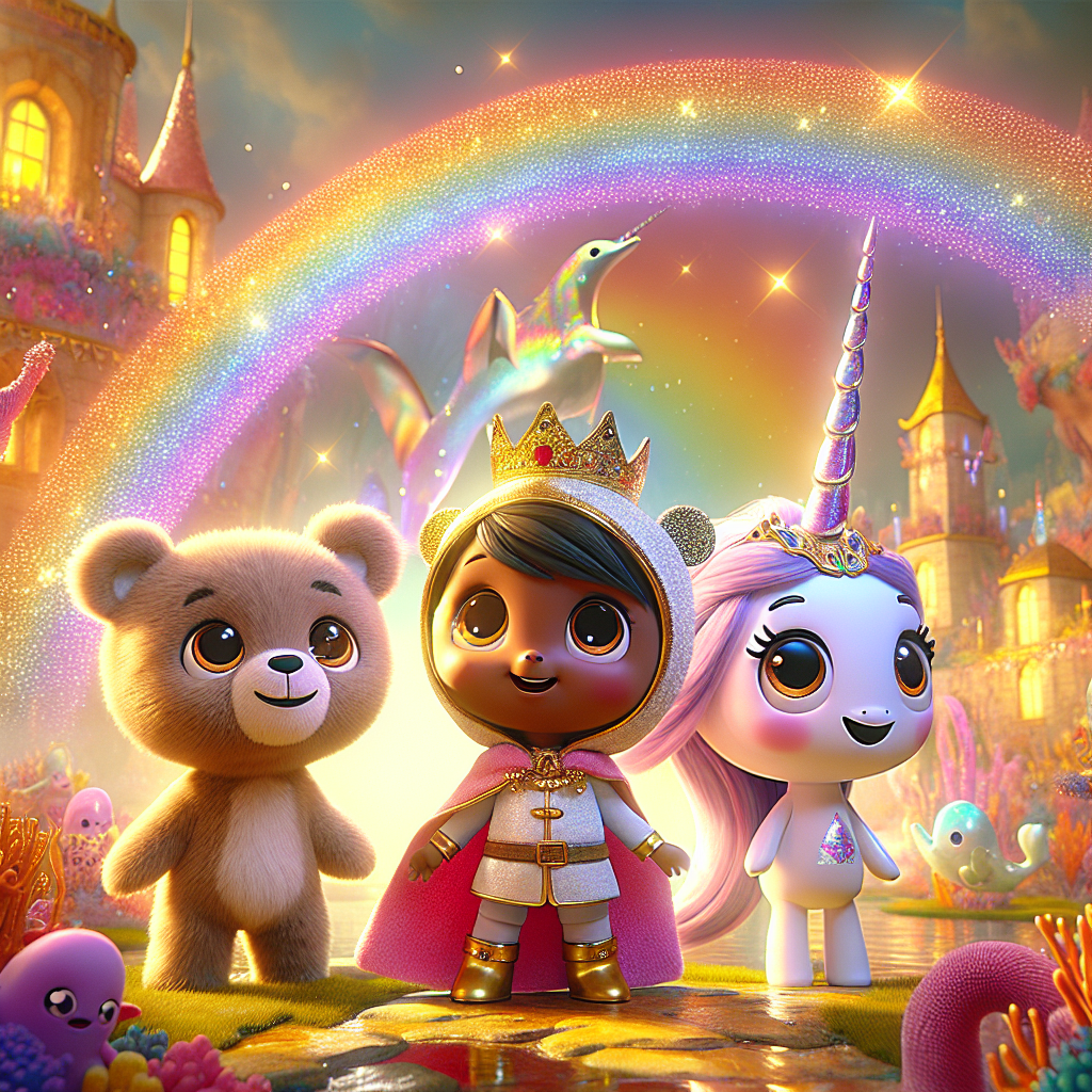 На допомогу йому відразу ж прийшов Нідл, Лицар-Нарвал, найкращий друг принца, з блискучим шоломом та рогом, який світився, коли поруч були скарби. “У чому справа, Принце Пірат Ведмідь?” – запитав Нідл своїм мужнім голосом. Нідл був надзвичайно відважним і завжди готовий допомогти, особливо коли йшлося про пошуки скарбів. До них приєдналася Фрізл, Райдужний Дракон, пухнастий і веселий, який видихав замість вогню блискітки. Її луски змінювали колір, відображаючи її емоції, і саме зараз вони мали колір яскравого апельсина – від хвилювання! “Що трапилося, друзі? Де блиск?” – запитала Фрізл своїм дзвінким голосом.