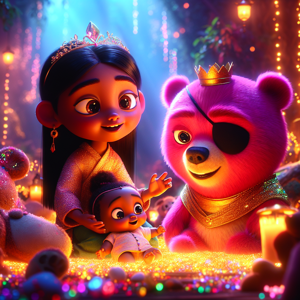 У Стрімкому Лісі, де дерева шепотіли секрети, жив Король Ведмедик. Він був дуже хоробрим ведмедиком з золотою короною та піратською пов'язкою на оці. Король Ведмедик любив все гаряче-рожеве, як пелюстки улюблених троянд принцеси Сітари. Він піклувався про свій ліс з добротою та обіймами. Але одного разу все змінилося. Ліс перестав блищати. Зник весь блиск! Дерева здавалися сумними, квіти втратили свій колір, і навіть сонце мало блиску. «О, ні!» – вигукнув Король Ведмедик, коли побачив, як тьмяніє ліс. Він подумав про принцес, які люблять блискітки та блискучі прикраси, як Дюк і Блю, і зрозумів, що щось не так.