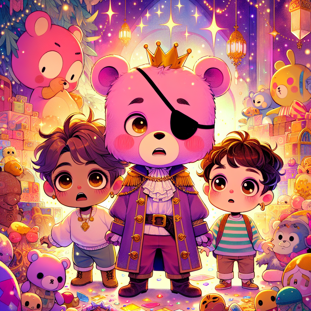 У Драконячому Гнізді, що блищало, як скриня з коштовностями, жила весела компанія. Тут було все: гори іграшок, блискучі камінчики та м'які пуфики. В центрі всього жив Принц Пірат Ведмідь, сміливий ведмедик з золотою короною та піратською пов'язкою на оці. Він обожнював корони, їх у нього було аж 37! Він також любив цукерки, цукерки, цукерки. О, і ще цукерки! Принц Пірат Ведмідь був дуже щедрим та завжди носив свій улюблений рожевий мішок, як у Азаль, в якому було багато цікавих речей. Ось тільки сьогодні мішка не було!