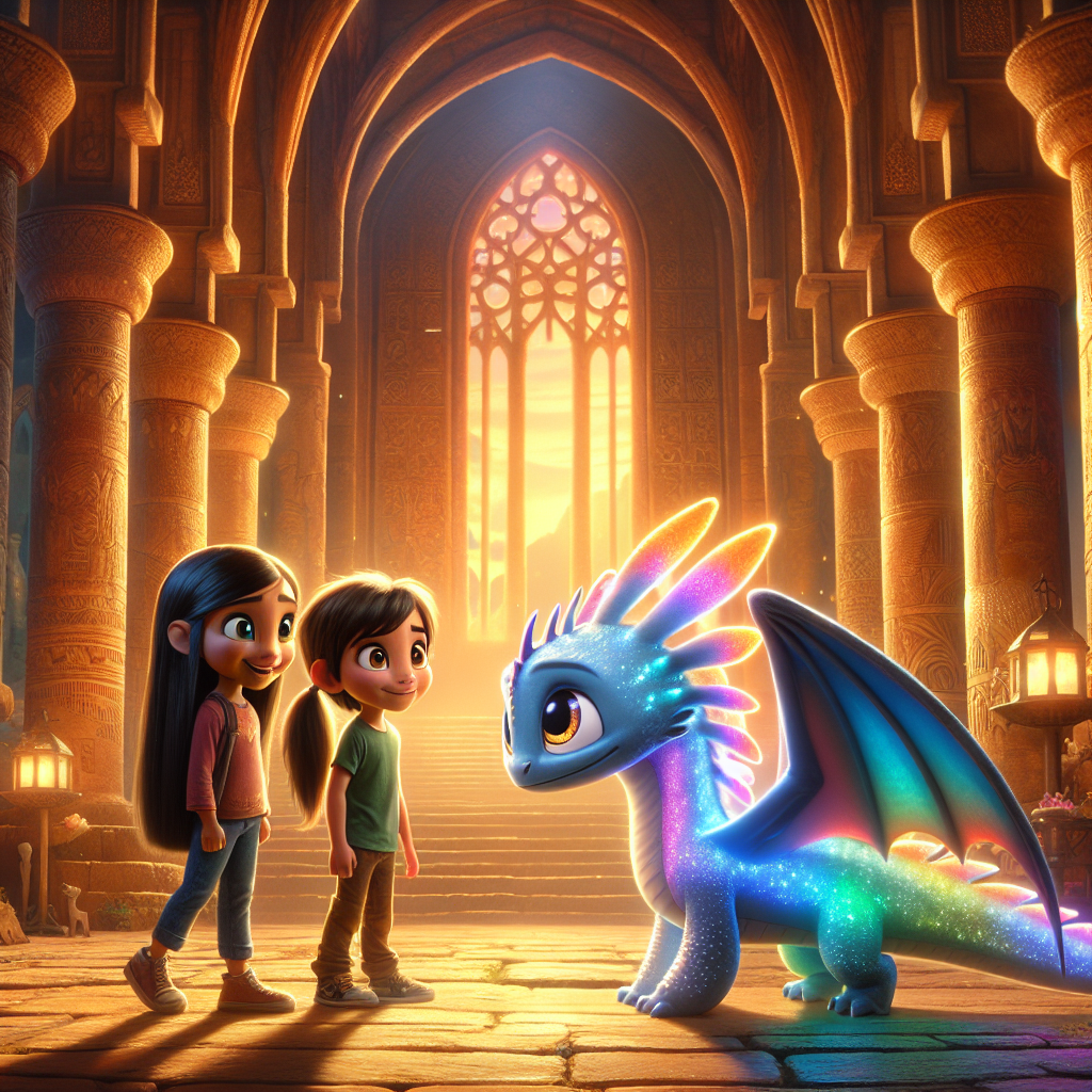 У серці цих руїн жили двоє найкращих друзів: Ракета Поп, космічний корабель глибини небесного блакитного кольору, що виблискував від хвилювання, і Фрізл, веселковий дракон, що випускав блискітки замість вогню. Ракета Поп любила подорожувати крізь блискучі галактики зі швидкістю мрій, а Фрізл обожнювала влаштовувати чаювання на вершинах гір. Сьогодні, коли сонце засяяло над руїнами, Ракета Поп пульсувала від хвилювання. Її колір змінився з небесно-блакитного на яскраво-рожевий, коли вона подумала: "Фрізл, ти хочеш піти зі мною до Стародавніх Руїн?"