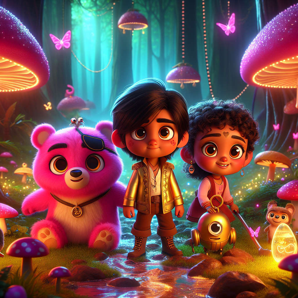 У самому серці Страшного Лісу, де дерева шепочуть секрети, а листя танцює на вітрі, жив принц Пірат Ведмідь. Він був дуже відважним ведмедем з золотою короною та піратською пов’язкою на оці. Він любив медв’яний чай і захищав своє королівство з добротою та обіймами. Його корона була рожевою! Одного разу, коли він якраз мріяв про смачну піцу та дивився, як динозаври граються у дворі, до нього підлетіла синя пташка. "Принц Пірат Ведмідь!" – цвірінькнула вона. "Є важливий наказ від королеви! У принцеси Сітари, а також її двоюрідних братів, Дюка і Блу, зникла королівська корона!" Принц Пірат Ведмідь нахмурився. "О, ні! Це велика біда!" – вигукнув він. "Ця корона особлива, така ж як і у принцеси, і також потрібна для всіх. Зрозуміло, у всіх моїх друзів теж є свої корони! Ми негайно вирушимо на пошуки!" Він одразу ж покликав своїх найкращих друзів: Зоггі, робота-приятеля, та Ролло, колючого їжака. Зоггі був веселим космічним роботом, який умів перетворюватися на 15 різних форм. Він завжди був готовий до міжгалактичної гри в хованки. А Ролло був дуже швидким, завжди носив з собою перекус у своєму маленькому поясі. "До роботи, друзі!" – сказав Принц Пірат Ведмідь. Вони вирушили в дорогу, готові до пригод. Вони зібрали свої улюблені речі: вантажівки для Джахаана, а для принцеси Сітари та інших друзів – чарівні сукні та улюблені солодощі. Дорогою вони думали про піцу, яка стане смачним заохоченням після виконаної роботи, та про те, як вони усі разом будуть грати. Принц Пірат Ведмідь повів їх стежкою в глиб Страшного Лісу, де дерева сміялися, а сонце кидало довгі тіні. Зоггі, використовуючи свою технологічну майстерність, залишив за собою слід з космічного пилу, щоб вони знали дорогу. Вони йшли веселою компанією, розмовляючи і сміючись, сповнені рішучості знайти корону та повернути її власникам.