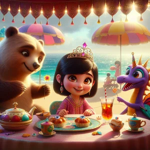 У сонячному березі, де сонце завжди сяяло, жила принцеса Люма. У неї було волосся кольору глибокого рожевого, яке завивалося, мов цукерки! Найбільше вона любила метеликів, з якими могла розмовляти. Її тіара була зроблена з зірки, що впала, і світилася так яскраво, як сонце! Одного разу принцеса Люма вирішила влаштувати велике чаювання на сонячному пляжі. Вона запросила свого найкращого друга, Беарона, королівського пухнастого ведмедика. Беарон був мудрим та справедливим, а ще любив обійматися та влаштовувати чаювання. Його корона завжди виблискувала, а його чарівна паличка була ще й медогоном! "Привіт, Люма! Яка чудова ідея влаштувати чаювання!" - сказав Беарон, поправляючи свою корону.