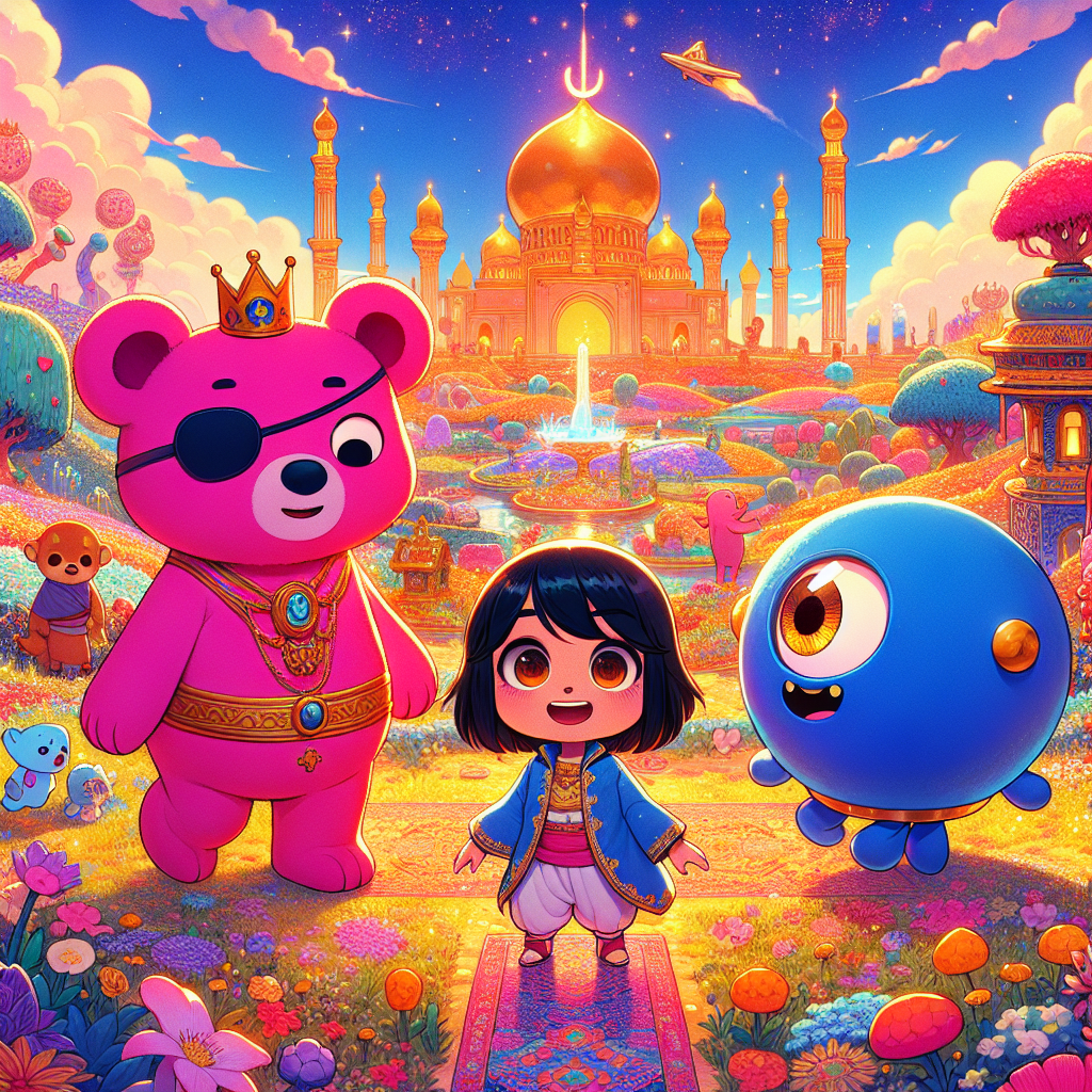 اس باغ میں ایک بہادر، رحم دل اور شاہی شہزادہ رہتا تھا، جس کا نام تھا پائرٹ شہزادہ ریچھ۔ اس کا رنگ گلابی تھا اور اس نے اپنی ایک آنکھ پر پٹی باندھ رکھی تھی۔ اس کے سر پر ایک سنہرا تاج سجا ہوا تھا، اور اس کے پاس 37 مختلف تاجوں کا مجموعہ تھا۔ پائرٹ شہزادہ ریچھ صبح سویرے اٹھتا، جنگل کے جانوروں کو سلام کہتا، اور شہد کی چائے پیتے ہوئے تتلیوں کو دیکھتا۔ اس کے پاس ایک تھیلا بھی تھا جس میں چمکدار پتھر اور خزانے تھے۔