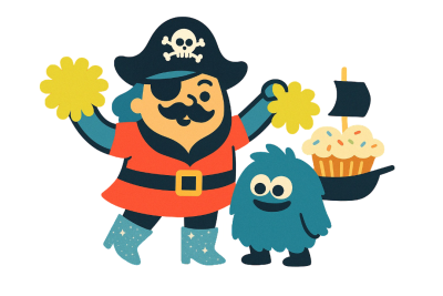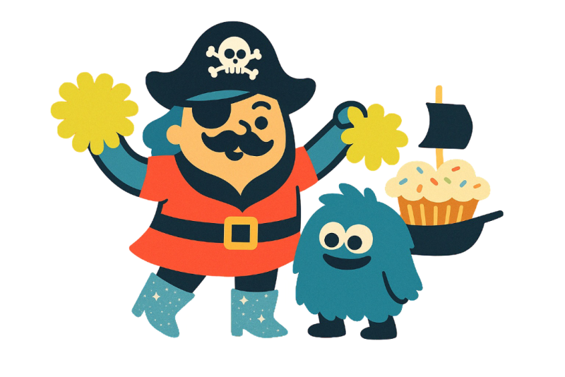 一个穿着闪亮靴子的啦啦队长海盗,拥有一艘由纸杯蛋糕制成的船。