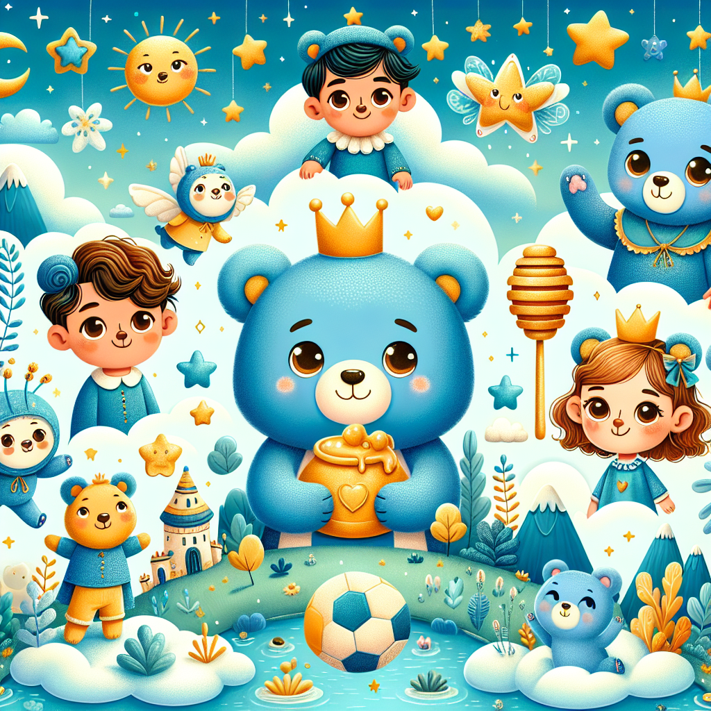 很久很久以前,在天空之上,有一片神奇的地方,叫做飘浮岛屿。这些岛屿像棉花糖一样,在云朵间飘来飘去。飘浮岛屿上住着许多有趣的居民,比如说,熊宝宝贝隆,一只毛茸茸的蓝色熊,戴着闪闪发光的皇冠,总是笑眯眯的。他最喜欢的事情就是举办茶会,和大家一起分享美味的蜂蜜饼干。“嘿,大家好!”贝隆用他温柔的声音说道,“今天我们又要举办盛大的足球比赛啦!”