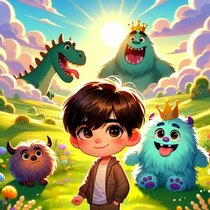 在宁静的和平草地上,住着一位名叫贝隆的云朵王子。贝隆是一只高贵的,深天蓝色的毛茸茸的熊,头戴着闪闪发光的皇冠,他用公平、拥抱和茶会来统治着这片土地。他的皇家权杖还是一个蜂蜜勺子,用来舀取他最喜欢的蜂蜜。贝隆的毛总是蓬松而柔软,但今天,他的毛发有些不一样,没有像往常一样蓬松,这让他皱起了眉头。